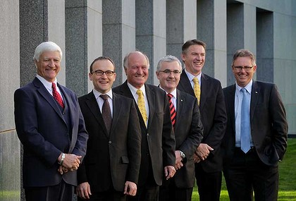 This photo by Andrew Meares of L-R: Bob Katter, Adam Bandt, Tony Windsor, Andrew Wilkie, Rob Oakeshott and Tony Crook is featured in a story by Misha Shubert about the Independent MPs who negotiated with Julia Gillard and Tony Abbott to decide who should form government after the election in August, 2010, which resulted in a hung parliament. It prompted me to add another verse to the pome I wrote at the time.