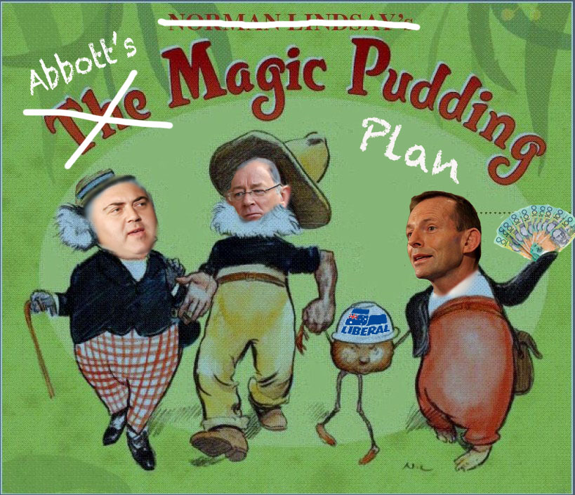 Easy to understand the disquiet of Coalition senior figures, particularly Shadow Treasurer Hockey and Finance Minister Robb. Though with or without Abbott’s grand policy proposals designed to win over women voters even Hockey sometimes seems to believe in a magic pudding sort of budget plan. Last month he said, “a Coalition government will deliver surpluses while reducing the tax burden on Australians and businesses………..We will run a surplus in our first term and every term after that, based on the information available at the moment.” However, his very latest Lateline comments about cutting welfare benefits to offset income tax cuts are more specific, particularly the one about the end of the the age of entitlement in our western world. He seems to want to reduce most working Australians to the living standards of Asia! No magic pudding faith there.